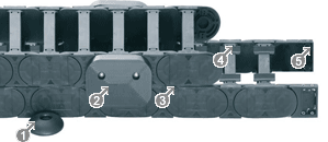 Special snap-open crossbars in the inner radius of the e-chains® with injection-molded AUTO-GLIDE sprockets for almost all E4.1 series.