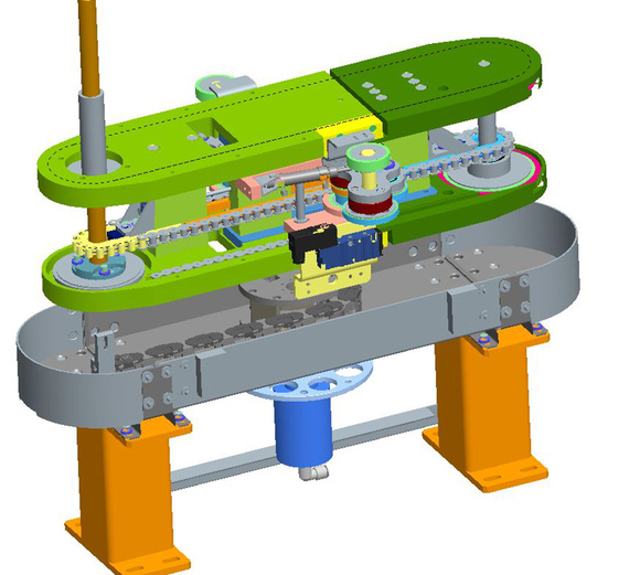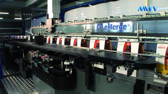This packing machine automatically turns single bottles inside the packing into the desired position. The difficulty was, to guide diverse data and supply cables of cells, valves and electrical signal transmitters in the continuously rotating machine in such a way, that no twisting occured. This was achieved with the c-chain® from igus®, in which the e-chain® continuously rotates.